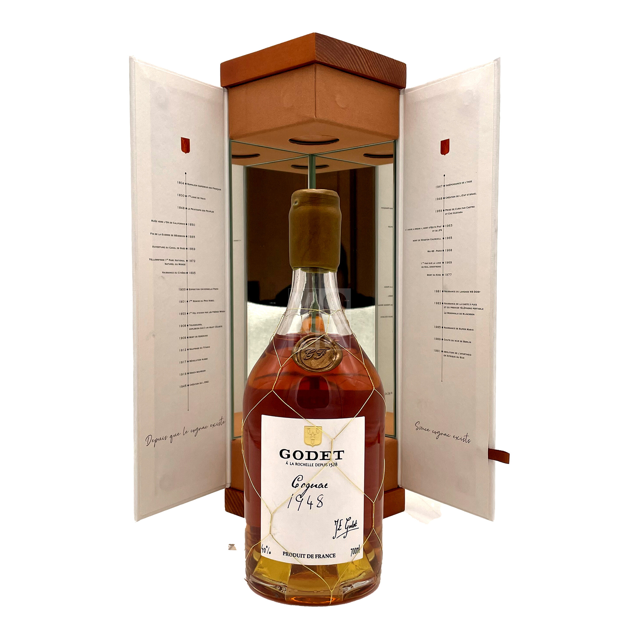 Decanted in an elegant and straightforward bottle design, Godet Millésime Fins Bois 1948 Cognac proves that, whilst presentation is essential - it’s what’s on the inside that counts the most. Nevertheless, this bottle will stand tall on the brandy shelf with its slim neck and smooth curves. Arriving in a sumptuous oak presentation box is a luxurious gift for someone who lavishes the finer things in life.