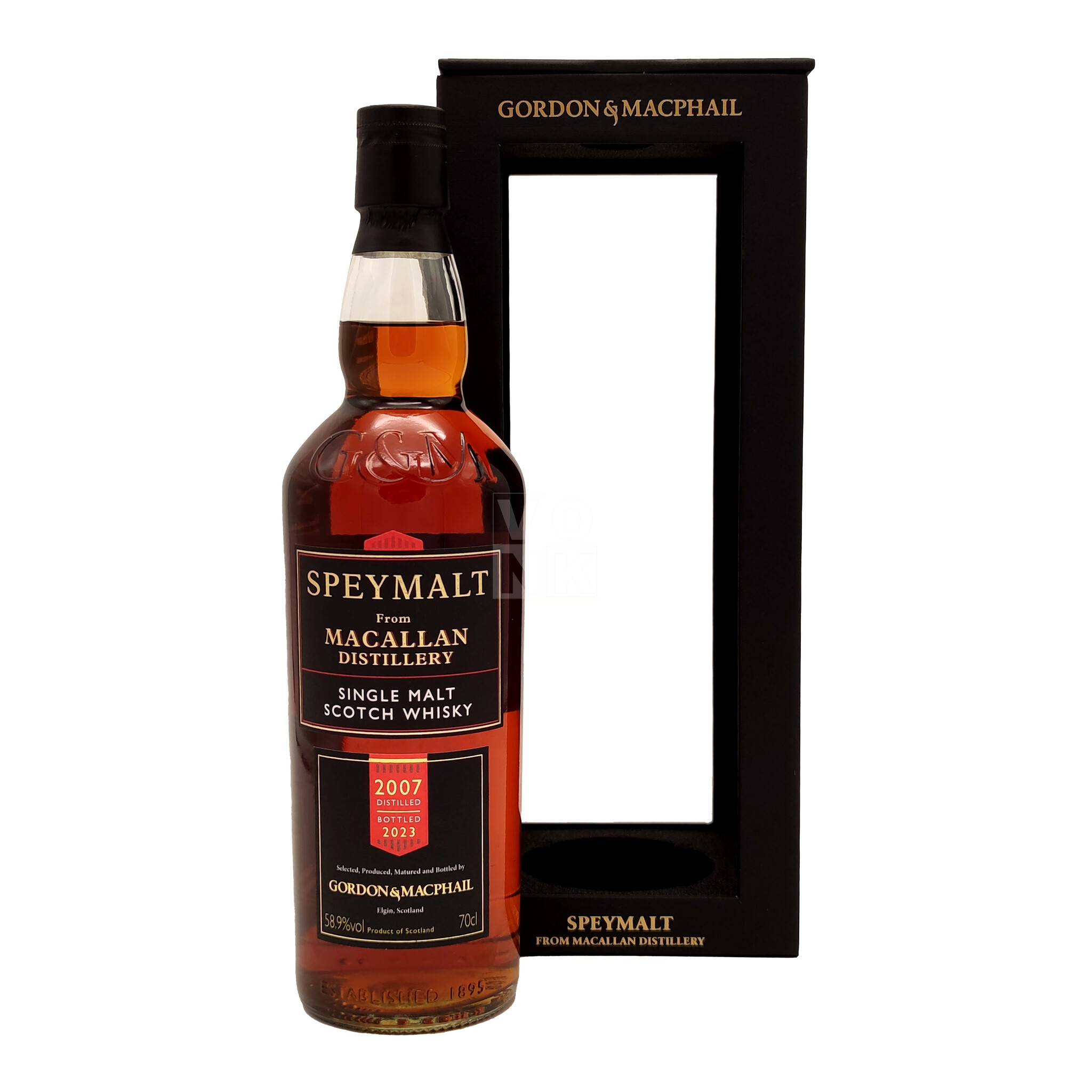 The Speymalt from Macallan Distillery range includes a series of exceptional single malts, each matured in the highest quality casks selected by Gordon & MacPhail. Sweet stewed raisins with citrus peel and mature oak. The palate is spicy followed by dark cherry, orange and black pepper. The finish holds roasted nuts and cocoa powder.