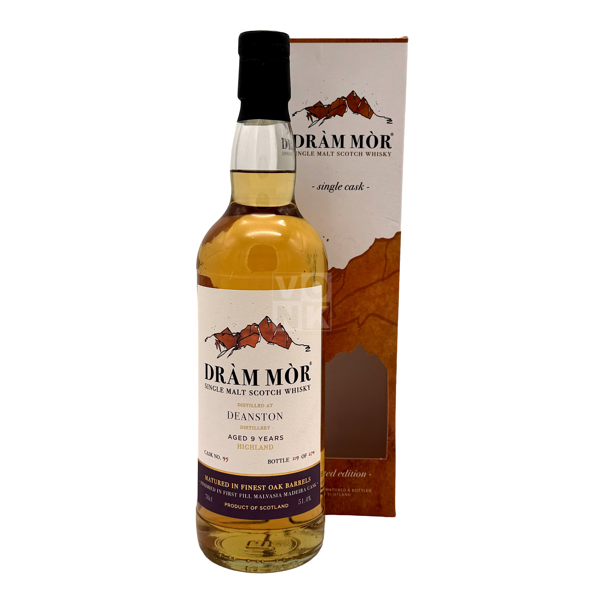 De Deanston 9 Years Old Dràm Mòr Cask 95 is niet zomaar een whisky; het is een kunstwerk dat de nauwgezette zorg en aandacht weerspiegelt die in de rijping is geïnvesteerd. Verzamelaars en liefhebbers die van deze gelimiteerde editie genieten, beleven een zintuiglijke reis die de harmonie viert tussen de spirit van Deanston en de rijke invloed van first-fill Malvasia Madeira-vaten. Het is een symfonie van rijping en elegantie, die iedereen die ervan geniet uitnodigt om de diepte en nuances van deze uitzonderlijke expressie te waarderen.
