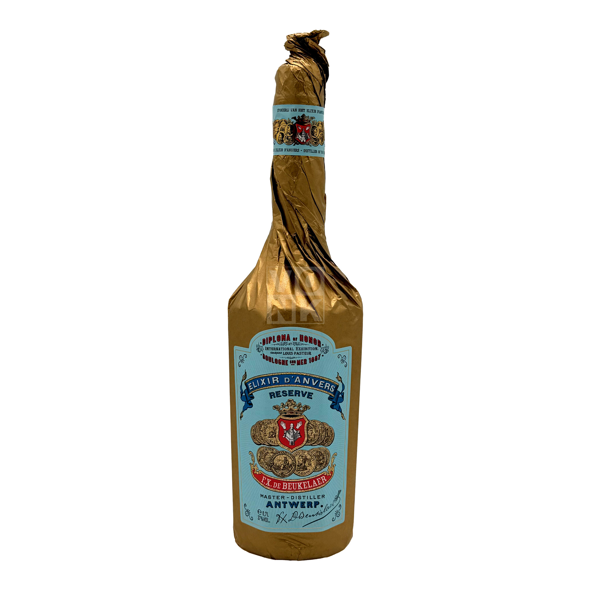 Elixir D'Anvers Reserve is een exclusieve en unieke editie van de ambachtelijk gestookte Elixir d'Anvers, een kruidenlikeur die al sinds 1863 volgens het originele recept wordt gemaakt in Antwerpen. Deze speciale editie heeft een langere rijping ondergaan in zorgvuldig geselecteerde kleine eiken vaten, waardoor er een complexe evolutie van smaken is ontstaan die de zintuigen prikkelt en een echt uniek en beperkt product creëert. Elixir D'Anvers Reserve heeft een verfijnd aroma van tientallen planten, kruiden en schorsen die in de likeur zijn geïnfuseerd, met een subtiele toets van eikenhout en saffraan. De smaak is delicaat en danst licht op de tong, om vervolgens een volle explosie van smaak te onthullen op het gehemelte, gevolgd door een verfrissende en kruidige afdronk die lang blijft hangen na de laatste slok. Met een alcoholpercentage van 37% is Elixir D'Anvers Reserve een krachtige en elegante likeur die perfect past bij elke gelegenheid, van aperitief tot dessert.