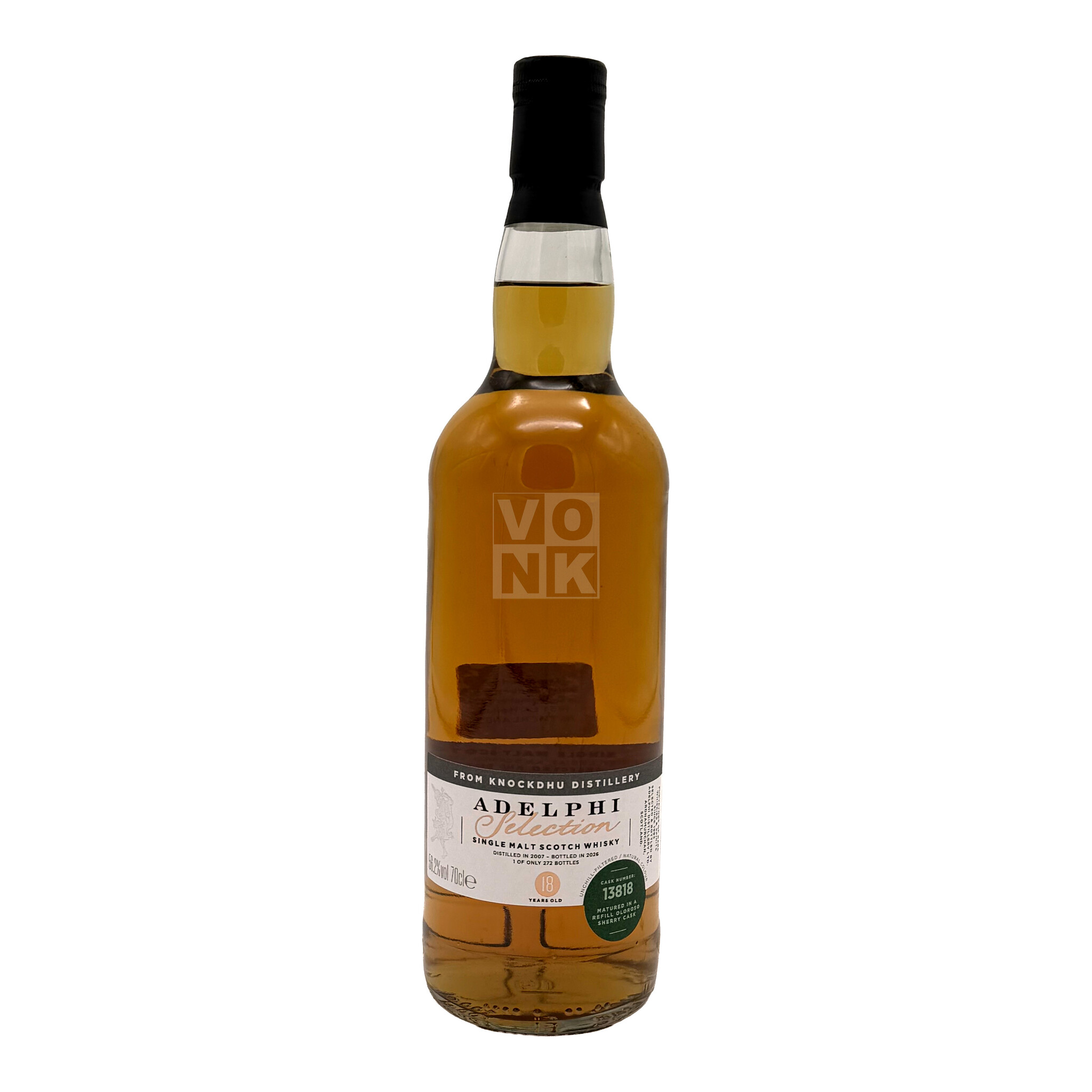 Proefnotitie Geur Vol en gelaagd met gedroogde abrikoos, rozijnen en sinaasappelschil, maar met veel lucht ertussen door de refill invloed. Daarachter appel, peer en citroenolie, gevolgd door walnoot, amandel en een zachte toets van bijenwas. Met tijd komen er theebladeren, leer en gepolijst eiken naar voren, met een fijne kruidigheid die aan gember en nootmuskaat doet denken. Smaak Krachtig en olieachtig met een mooie balans tussen fruit en droge sherrystructuur. Eerst honing, citruszeste en rijp boomgaardfruit, daarna schuift het richting notige diepte met cacao, geroosterde amandel en een licht espressoachtig bittertje. De 56.2% geeft een stevige ruggengraat, met kruidige eik, zwarte peper en een subtiele tanninerijke grip die het geheel strak houdt. Afdronk Lang en elegant drogend met aanhoudende sinaasappelschil, noten en cacaotonen. Naar het einde toe meer thee, kruidige eik en een warme, licht bittere echo die uitnodigt tot de volgende slok. Knockdhu Distillery Knockdhu Distillery, gelegen nabij het dorp Knock in Aberdeenshire, Schotland, werd opgericht in 1894 door John Morrison. De distilleerderij ligt aan de voet van Knock Hill, wat zorgt voor een schilderachtig en idyllisch landschap. Knockdhu, beter bekend onder de merknaam "anCnoc," heeft een lange geschiedenis in het produceren van hoogwaardige single malt whisky's. Een uniek kenmerk van Knockdhu is het gebruik van water uit de nabijgelegen Knock Hill, wat bijdraagt aan de zuiverheid en het karakter van hun whisky's. De whisky's van Knockdhu staan bekend om hun lichte, frisse en fruitige smaakprofielen, met tonen van citroen, appel, honing en een vleugje vanille. De distilleerderij gebruikt traditionele koperen distilleerketels en rijpt hun whisky voornamelijk in ex-bourbon- en sherryvaten, wat zorgt voor een evenwichtige en complexe smaak. Knockdhu is trots op zijn ambachtelijke benadering van whiskyproductie, waarbij traditionele methoden worden gecombineerd met een moderne visie. De combinatie van een prachtige ligging, traditionele technieken en hoogwaardige productie maakt Knockdhu een gerespecteerde naam in de wereld van Schotse whisky.