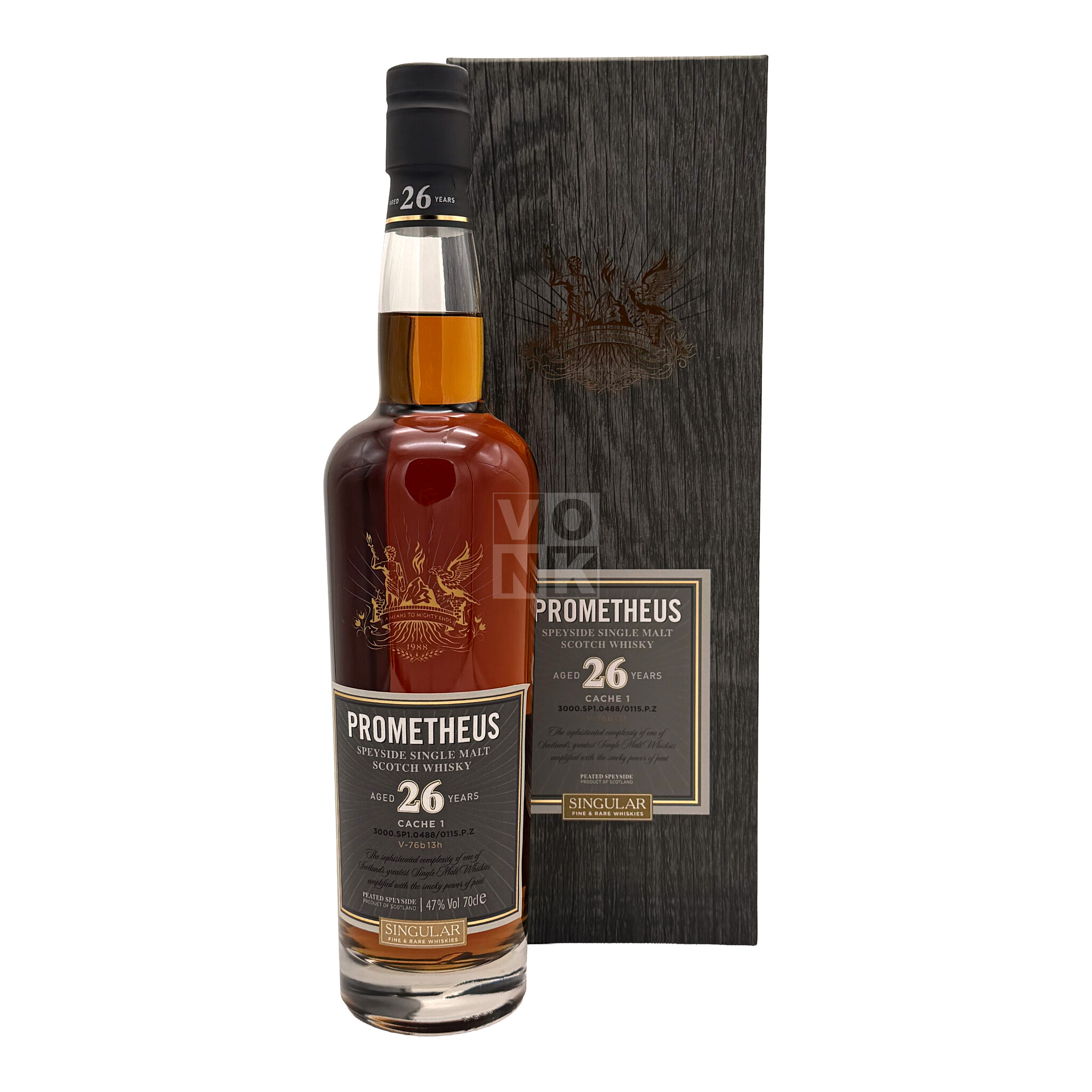 Prometheus Scotch Single Malt 26 Years Old 0,7l 47% De Prometheus Scotch Single Malt 26 Years Old kenmerkt zich door zijn onderscheidende en complexe smaak. De neus onthult een subtiel rokerig aroma in samenspel met exotische vruchten zoals sinaasappels en heide. Het bouquet is vrij zoet. In de mond is de Prometheus Scotch Single Malt 26 Years Old zeer romig, met smaken variërend van melkchocolade en geroosterde noten tot een vleugje vanille. Deze complexiteit ontwikkelde zich gedurende de 26 jaar rijping in een first-fill Spaans sherryvat. Het hout gaf de whisky een bijzonder karakter. In het glas imponeert de whisky niet alleen met zijn unieke aromatische structuur, maar ook met zijn kleur: een rijke amberkleur met subtiele koperkleurige accenten – een aanblik die elke whiskyliefhebber zal bekoren. Hoewel de aromatische kwaliteiten van de Prometheus Scotch Single Malt 26 Years Old duidelijk te beschrijven zijn, blijft de oorsprong ervan in mysterie gehuld. De Glasgow Distillery Company, de producent van deze whisky, verbergt vakkundig van welke distilleerderij de whisky uiteindelijk afkomstig is. Het enige bekende feit is dat de whisky uit Speyside komt, de Schotse whiskyregio. Dit geeft Prometheus Scotch Single Malt een zekere mystiek, zoals de naam al doet vermoeden, die is geïnspireerd op een legende uit het oude Griekenland. Prometheus Scotch Single Malt is een titaan, wiens kracht en vermogen, hoewel nooit overweldigend, een treffend statement maken over de rijke en eeuwenoude whiskycultuur die al eeuwenlang met passie wordt omarmd en bewaard door de Schotten. Kleur: Amber, koper. Neus: Exotisch fruit zoals sinaasappel, heide, rokerig, zoet. Aroma: Romig, geroosterde noten, melkchocolade, vanille. Afdronk: Langdurig. Prometheus Scotch Single Malt 26 Years Old