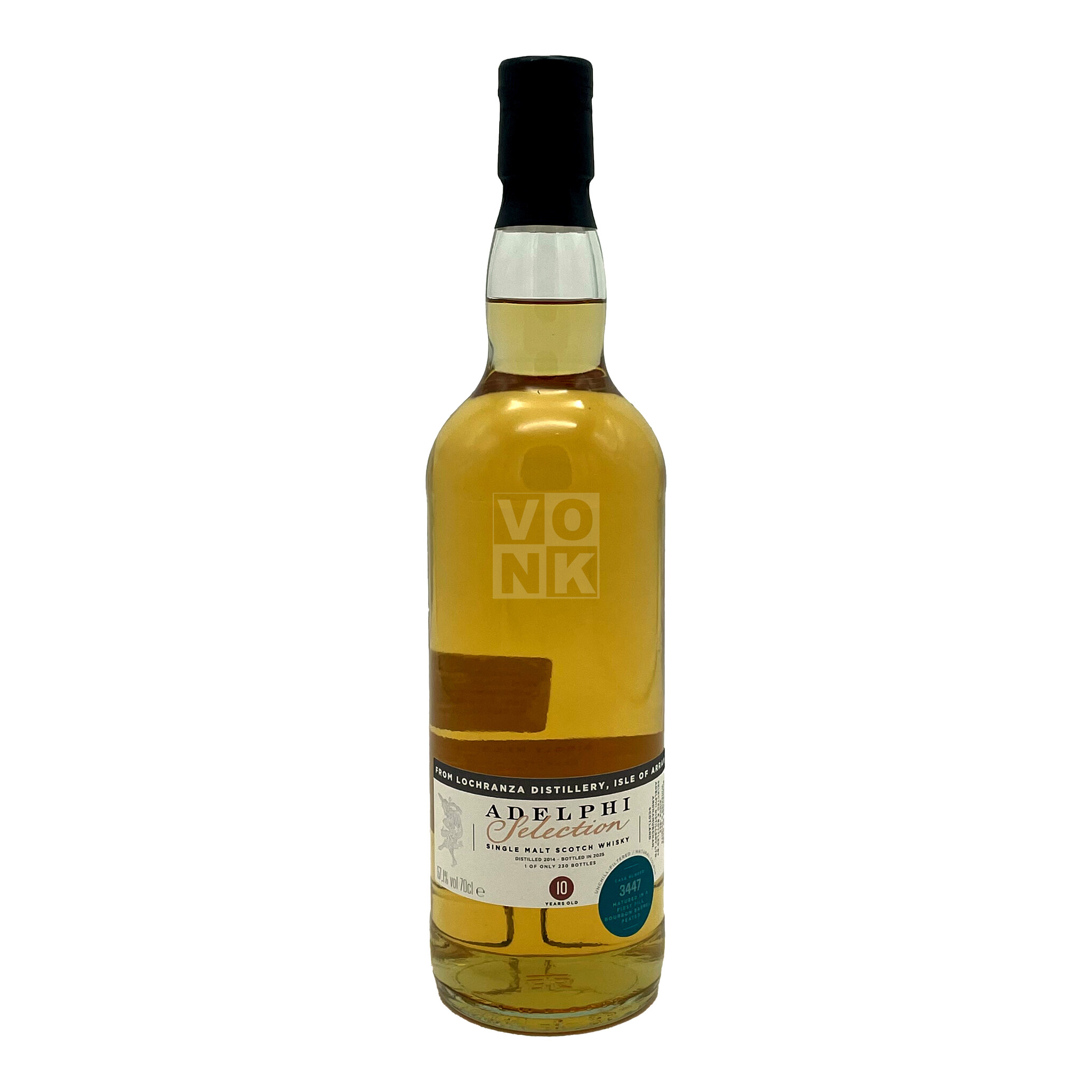 Een single cask Lochranza 2014, een 10 jaar oude single malt whisky van het eiland, uitgebracht door de onafhankelijke bottelaars Adelphi Distillers in 2025 als onderdeel van hun Adelphi Selection-serie.